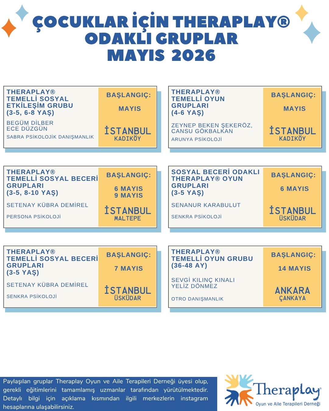 Detaylı bilgi almak istediğiniz gruplar için ilgili kurumun profiline aşağıdaki linklerden ulaşabilirsiniz🌼@arunyapsikoloji @ohanadanismanlik @psikolojibalat @sabrapsikoloji